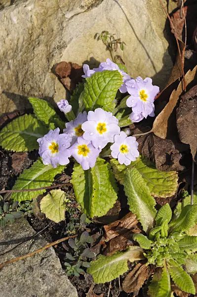 Hornveilchen (Viola cornuta), Kissenprimel (Primula vulgaris syn. Primula acaulis) und Echte Schlüsselblume (Primula veris)