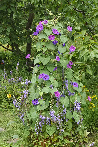Purpurne Prunkwinde (Ipomoea purpurea) auf einer Sichtschutzwand