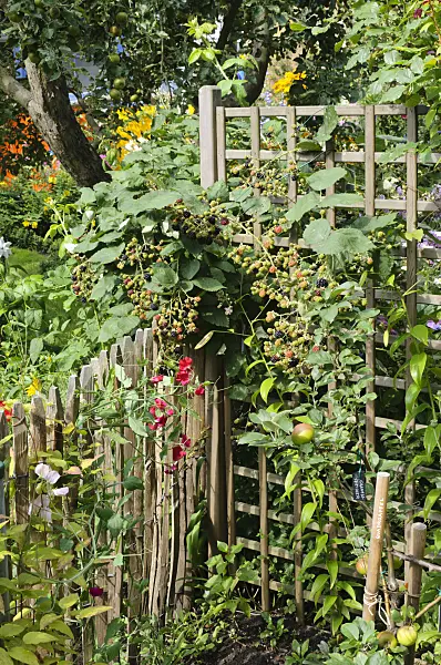 Brombeere (Rubus fruticosus) und Ginkgo (Ginkgo biloba) an einem Holzzaun