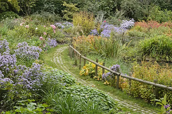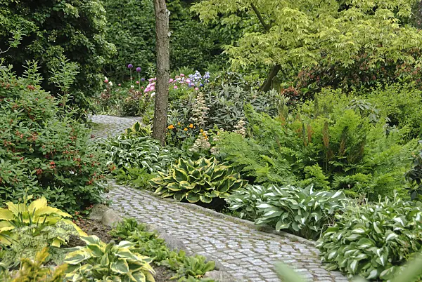 Lady's mantles (Alchemilla), cranesbills (Geranium), astilbes (Astilbe) and plantain lilies (Hosta)