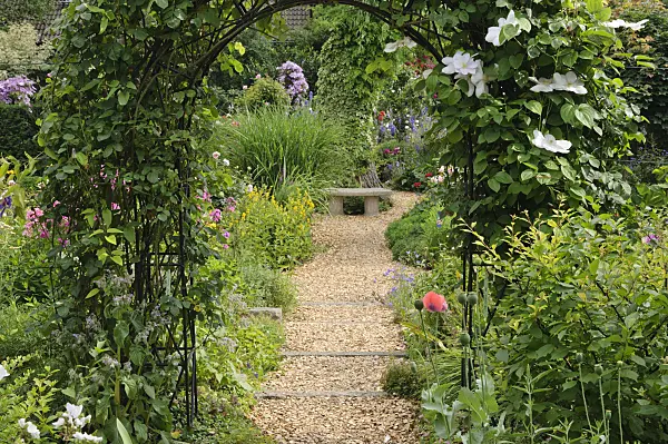 Clematis (Clematis) and roses (Rosa) in a rose garden