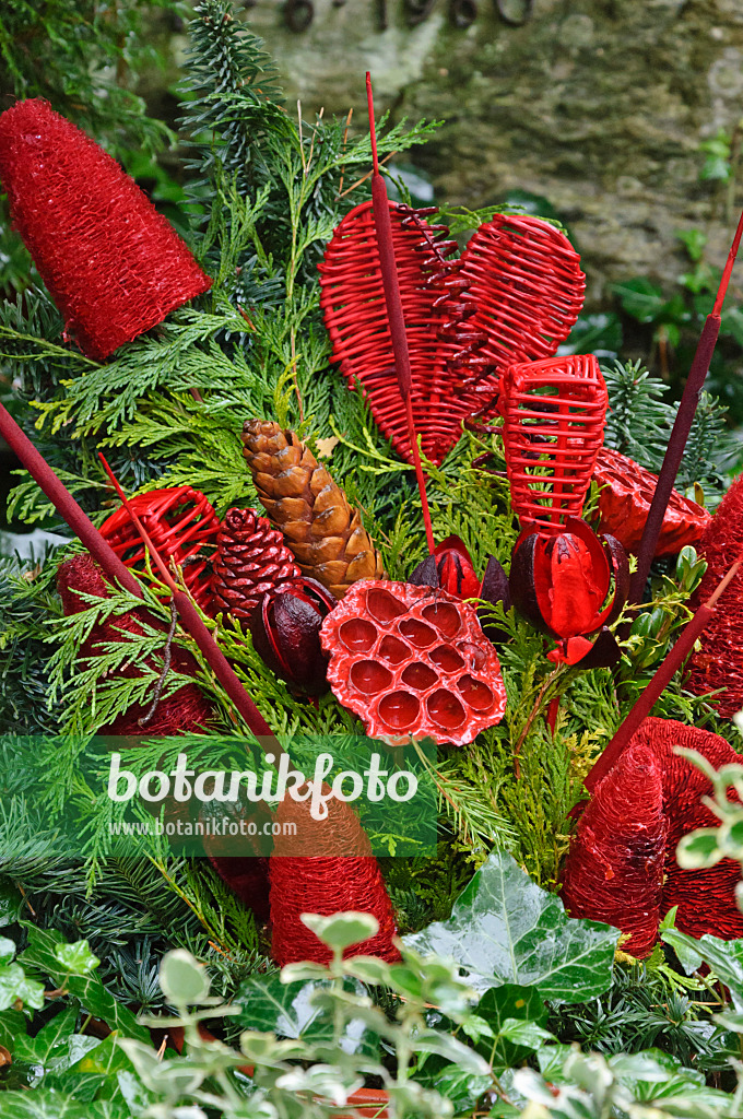 Chrysanthemums (Chrysanthemum), marigolds (Tagetes) and Japanese blood grass (Imperata cylindrica 'Red Baron' syn. Imperata cylindrica 'Rubra')