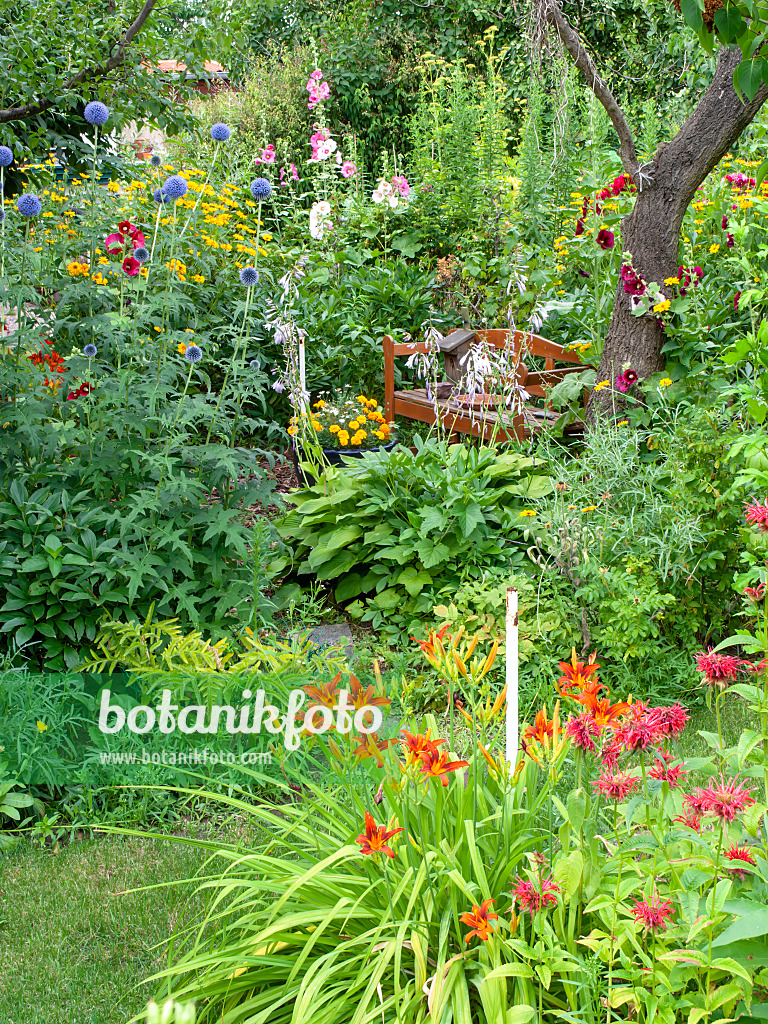 486250 - Globe thistles (Echinops), day lilies (Hemerocallis), hollyhocks (Alcea) and bee balms (Monarda)