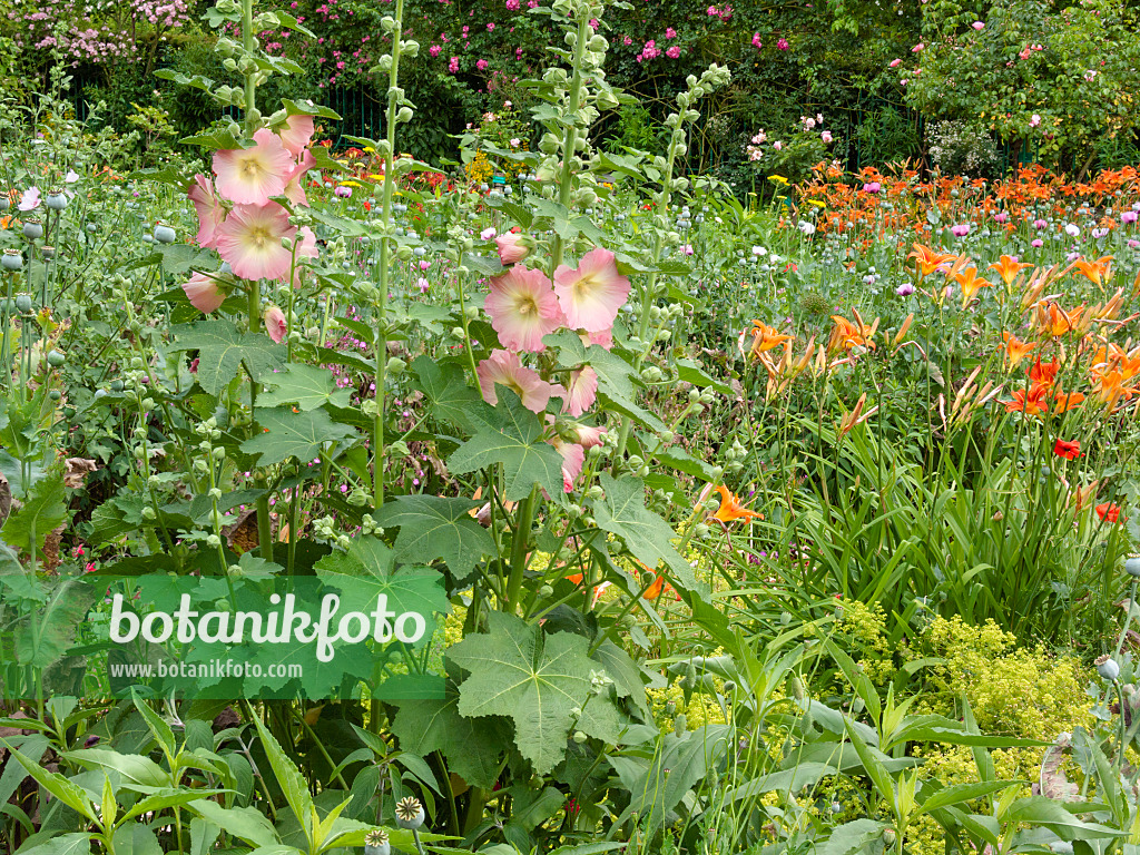 402151 - Hollyhocks (Alcea) and day lilies (Hemerocallis)