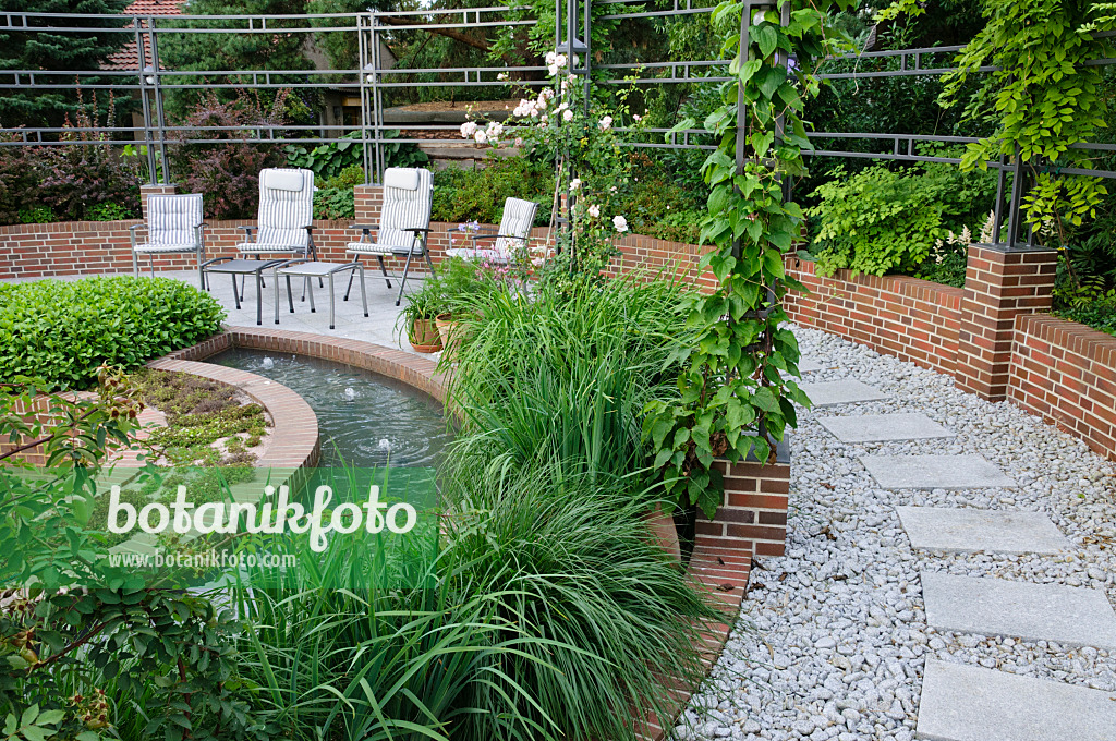 Fountain with alumroots (Heuchera) and plantain lilies (Hosta)