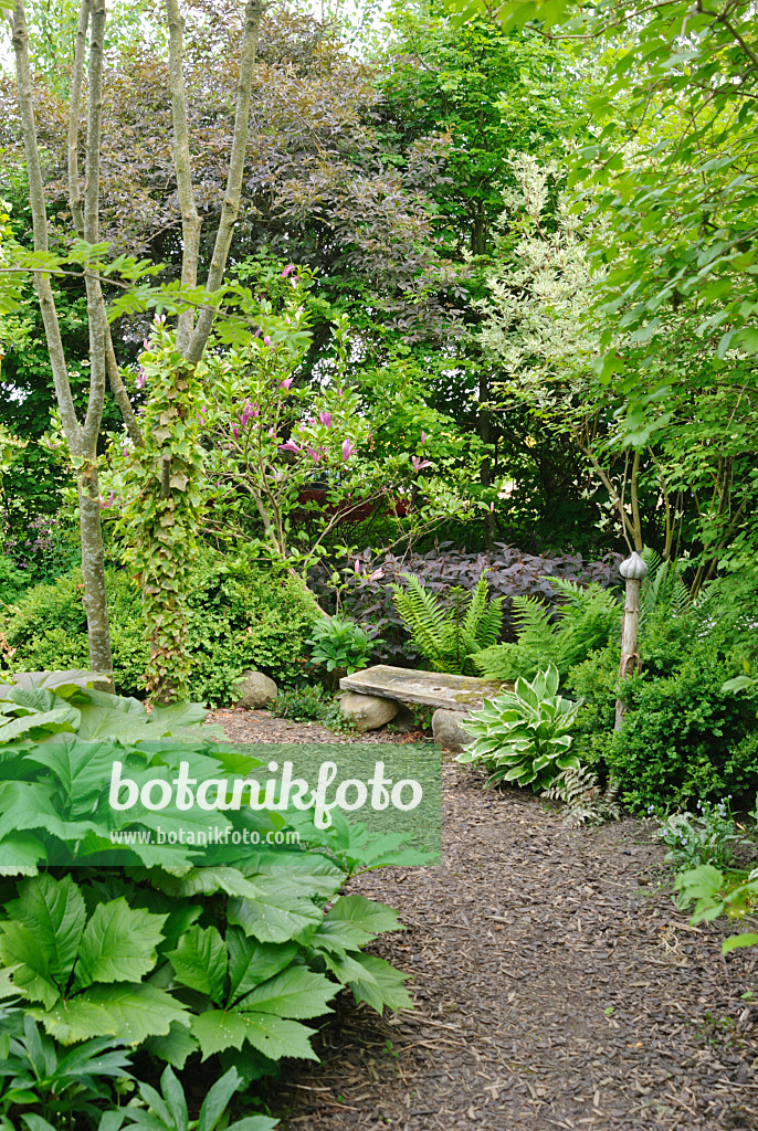 Lady's mantles (Alchemilla), cranesbills (Geranium), astilbes (Astilbe) and plantain lilies (Hosta)