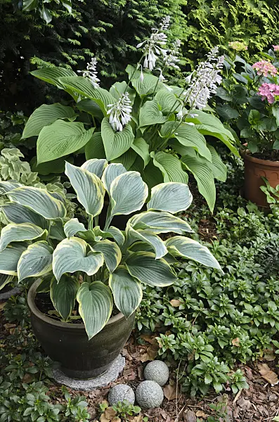 Plantain lilies (Hosta) in flower tubs