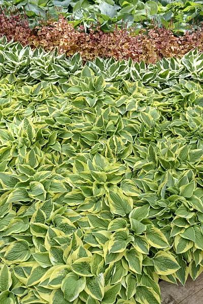 Plantain lily (Hosta Gold Standard), hairy alumroot (Heuchera villosa 'Caramel') and crevice alumroot (Heuchera micrantha 'Palace Purple')