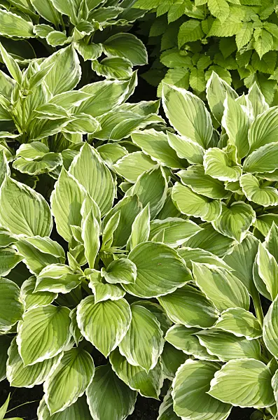 Plantain lilies (Hosta fortunei 'Francee' and Hosta Sum and Substance)