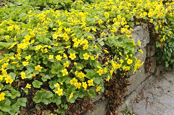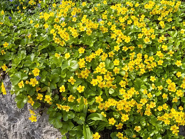 Violets (Viola) and bugles (Ajuga) in a raised bed