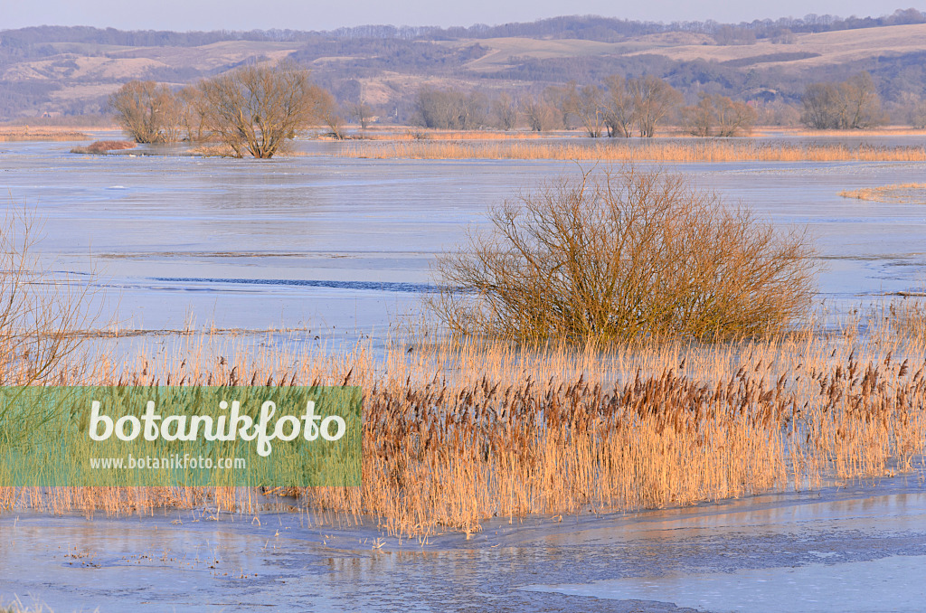Common reed (Phragmites australis) on a flooded and frozen polder meadow, Lower Oder Valley National Park, Germany