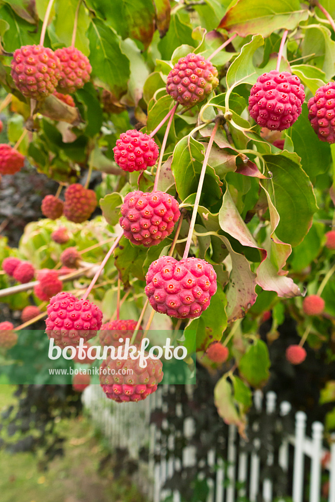 Cornus kousa, commonly known as Kousa Dogwood, is a small deciduous tree native to East Asia. It produces showy white or pink bracts in late spring, followed by edible red berries. The leaves turn vibrant red-purple in autumn. It prefers well-drained soil and partial shade. Resistant to dogwood anthracnose.