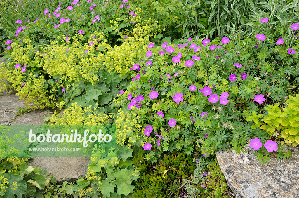Bloody cranesbill (Geranium sanguineum), lady's mantle (Alchemilla mollis) and flowering onion (Allium aflatunense)
