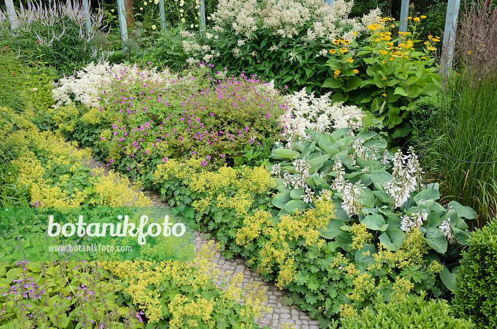 Lady's mantles (Alchemilla), cranesbills (Geranium), astilbes (Astilbe) and plantain lilies (Hosta)