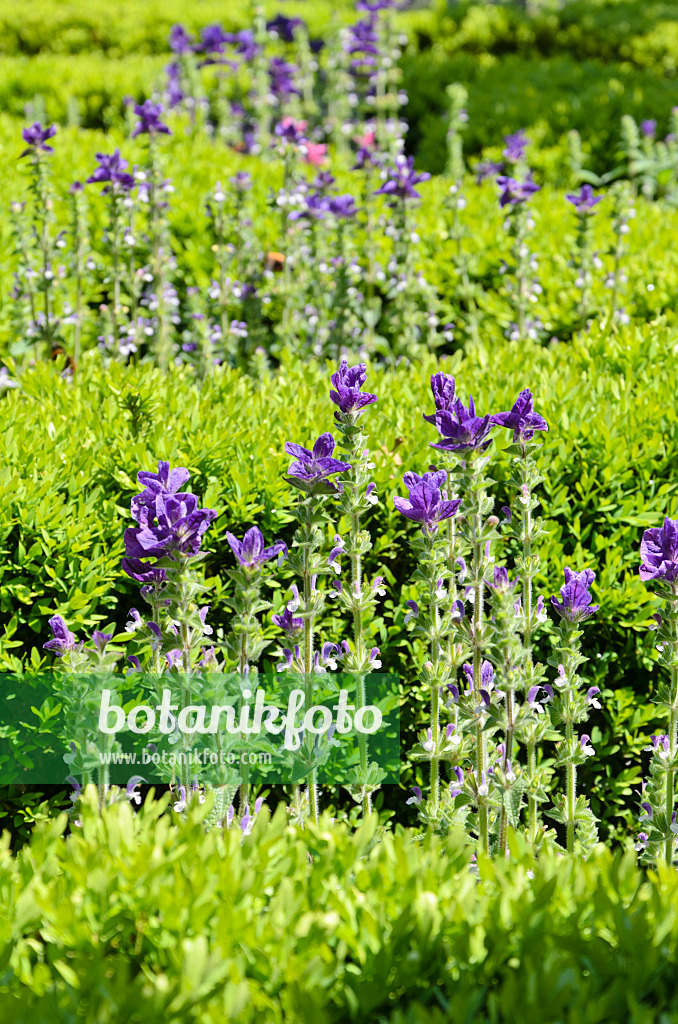 Columbines (Aquilegia) and boxwoods (Buxus) in a perennial garden