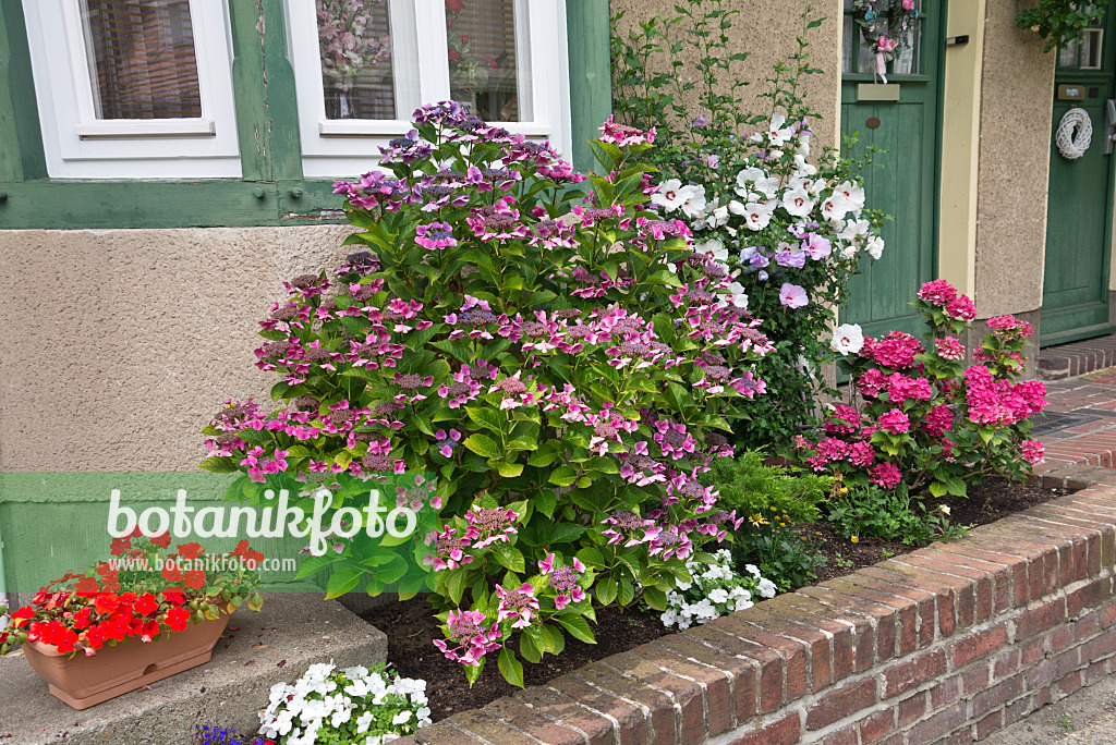 Hydrangea (Hydrangea), common hibiscus (Hibiscus syriacus) and buzy Lizzies (Impatiens walleriana)