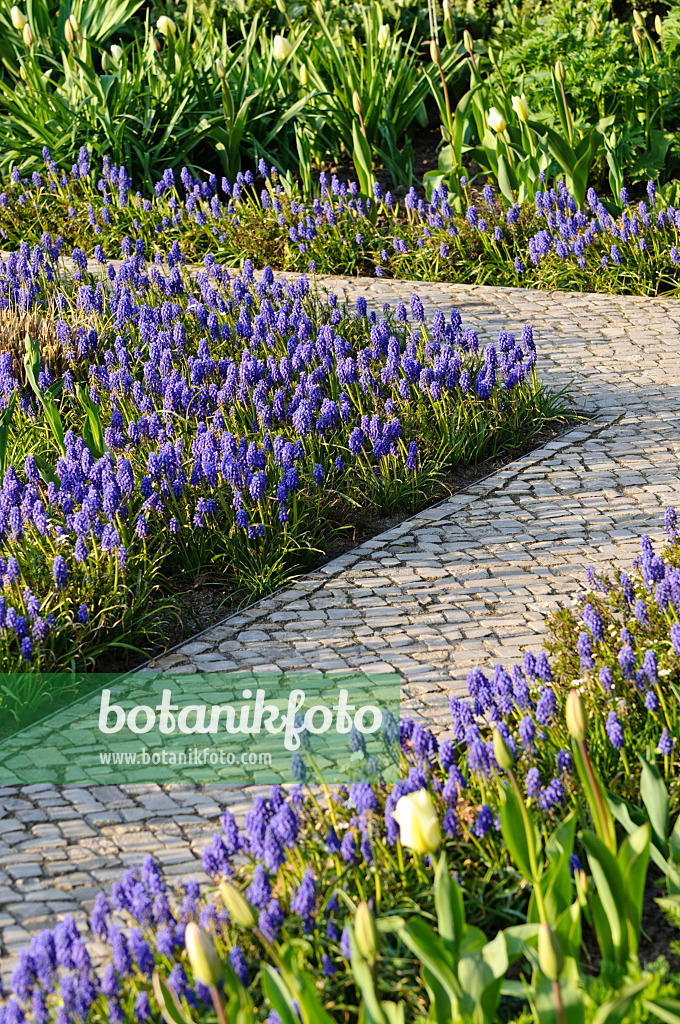 Muscari armeniacum, commonly known as Armenian grape hyacinth, is a perennial bulbous plant native to the eastern Mediterranean. It produces dense clusters of small, bell-shaped, deep blue flowers in spring. The foliage is narrow and grass-like. It thrives in well-drained soil and full sun to partial shade, making it popular in gardens and borders. Hardy and low-maintenance, it naturalizes easily.