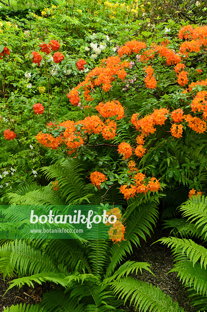 Azaleas (Rhododendron) and ostrich fern (Matteuccia struthiopteris)