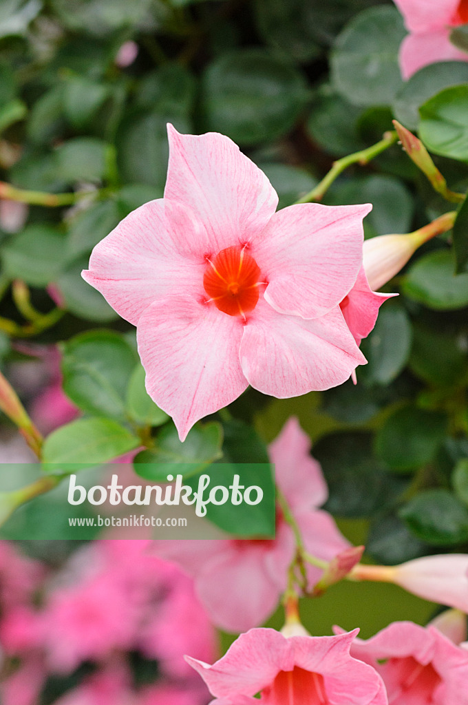 Mandevilla sanderi, also known as Brazilian jasmine, is a tropical flowering vine native to Brazil. It features glossy green leaves and produces clusters of trumpet-shaped pink or red flowers. It thrives in warm climates, prefers full sun to partial shade, and requires well-draining soil. Often grown as a container plant or trellis climber, it blooms from spring to fall. Regular watering and occasional fertilization promote healthy growth. It is not frost-tolerant and may need winter protection in cooler regions.
