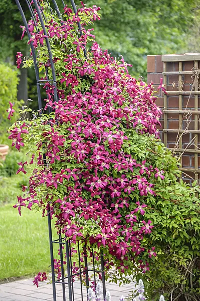 Clematis (Clematis Pink Fantasy and Clematis Ernest Markham) behind a seating area