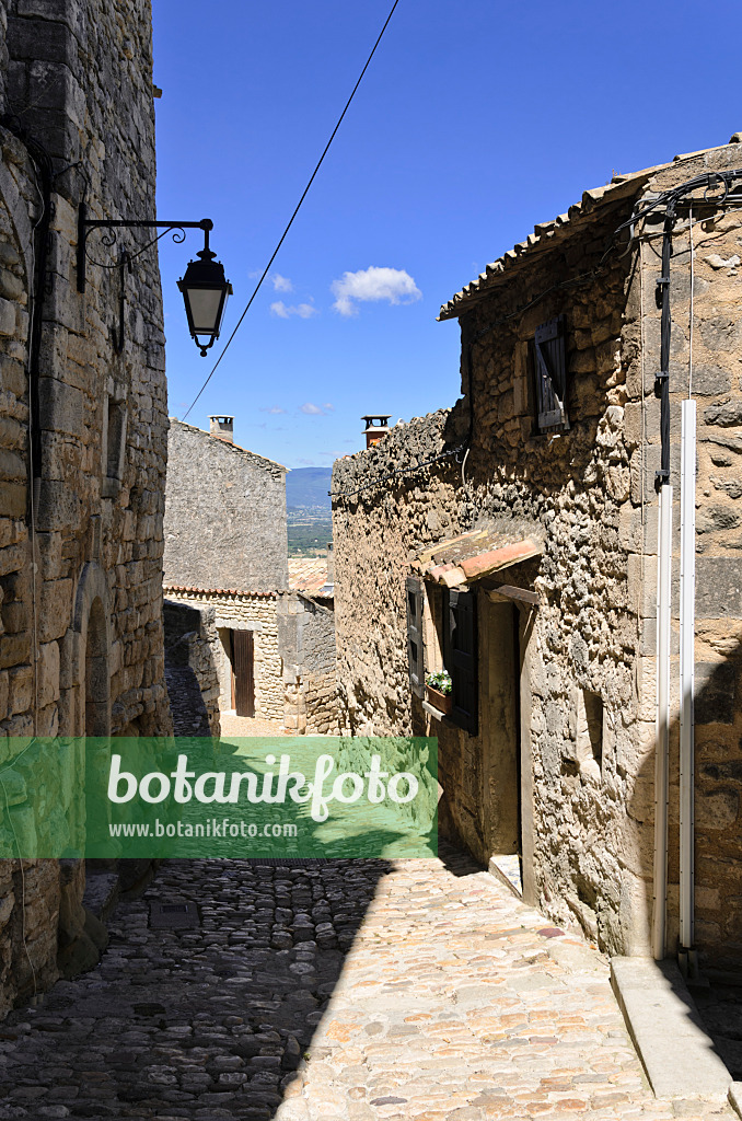 Cobbled path between houses with stone walls and iron lantern, Lacoste, Provence, France