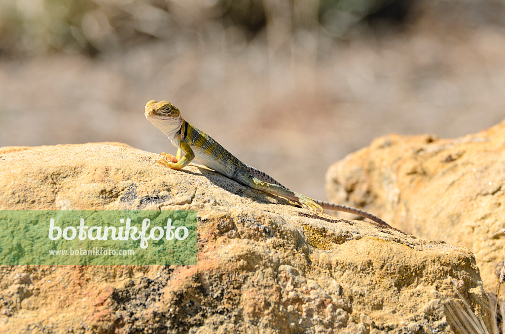 Collared lizard (Crotaphytus collaris) sits on a sandstone in the sun and is looking around