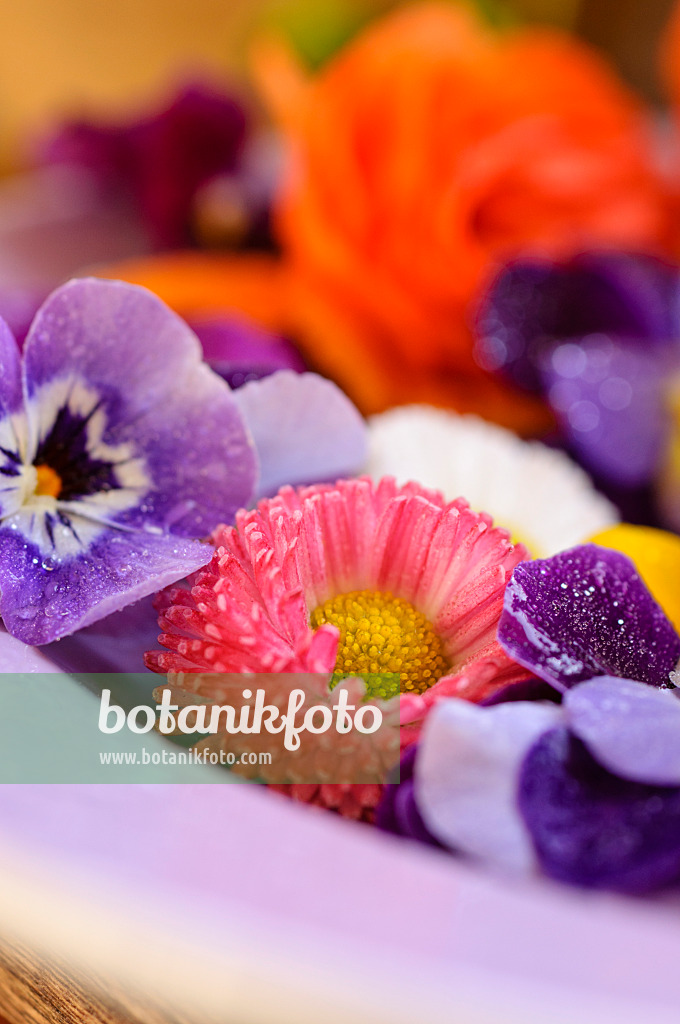 Common daisy (Bellis perennis) and horned pansies (Viola cornuta), cut flowers on a plate
