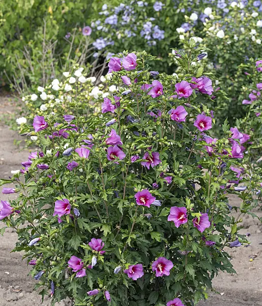 Hibiscus syriacus, commonly known as Rose of Sharon, is a deciduous flowering shrub native to Asia. It produces large, showy flowers in shades of white, pink, purple, or blue, blooming from summer to fall. It thrives in full sun and well-drained soil, tolerating drought and urban conditions. Often used in landscaping for its ornamental value, it can grow up to 3-4 meters tall. Hardy in USDA zones 5-9.