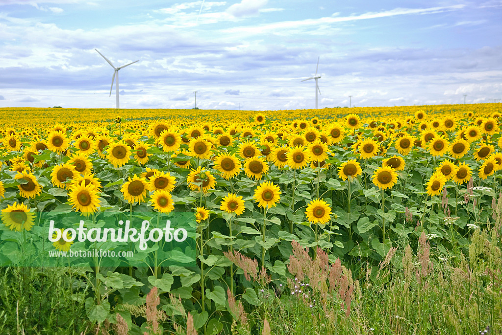 Common sunflowers (Helianthus annuus) with windmills