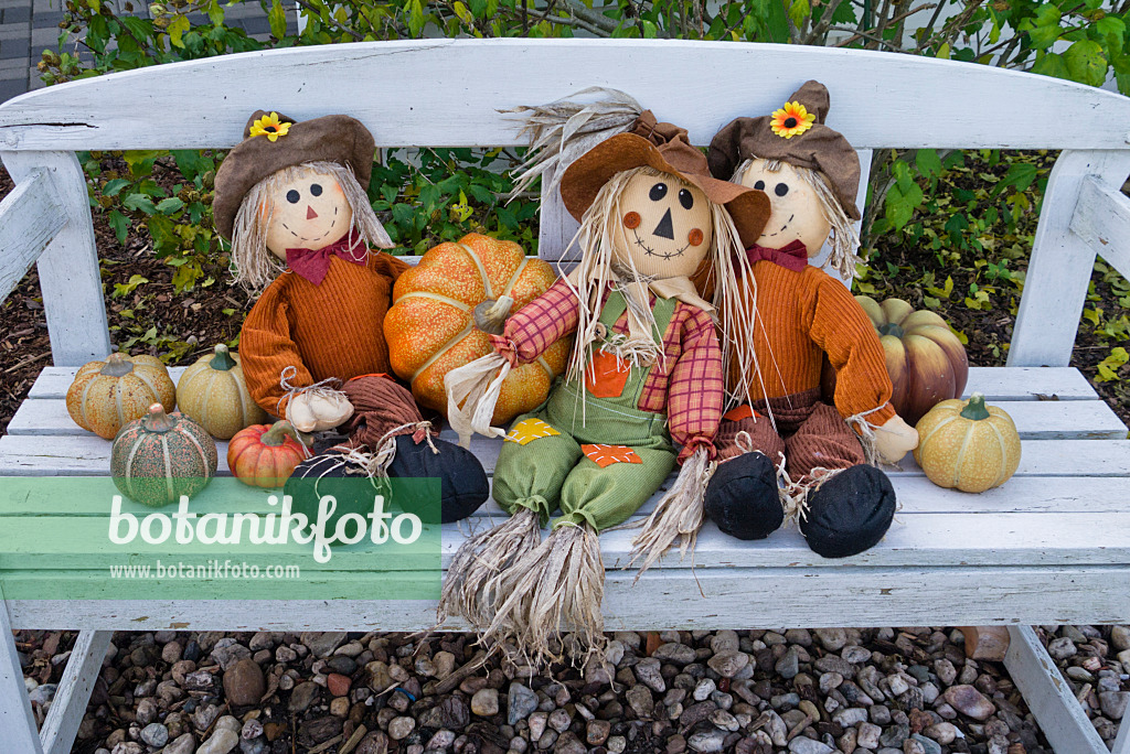 Decorative squashes (Cucurbita) with rag dolls on a garden bench