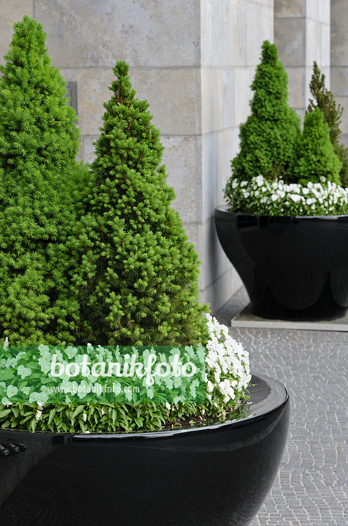 Dwarf Alberta spruce (Picea glauca 'Conica') and violets (Viola)