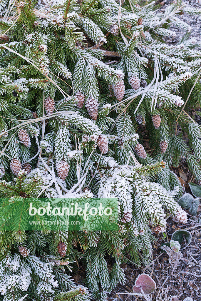 Dwarf common spruce (Picea abies 'Acrocona Nana') with hoar frost