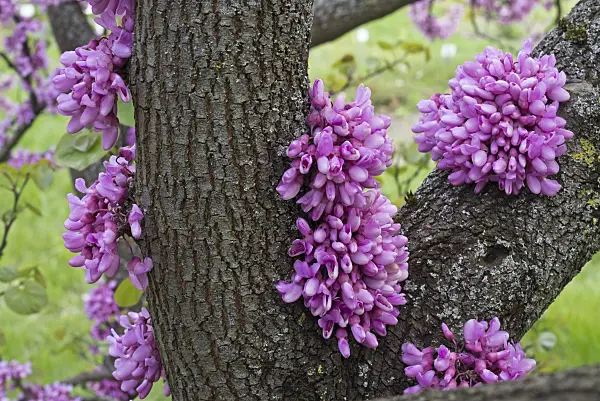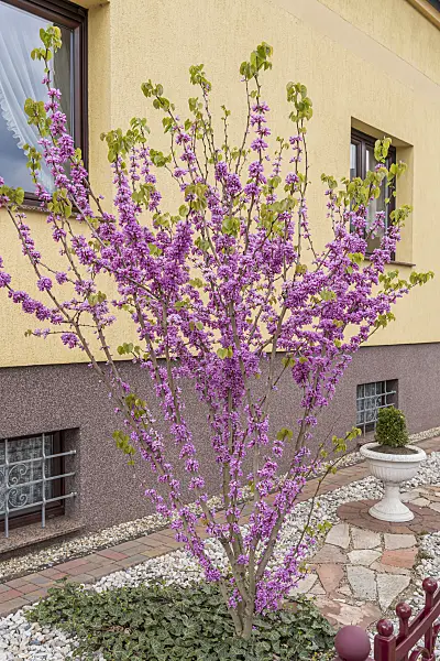 Cercis canadensis, commonly known as Eastern Redbud, is a small deciduous tree native to eastern North America. It is known for its striking pink to purple flowers that bloom in early spring before the leaves emerge. The heart-shaped leaves turn yellow in fall. It thrives in well-drained soils and prefers full sun to partial shade. Often used in landscaping for its ornamental value.