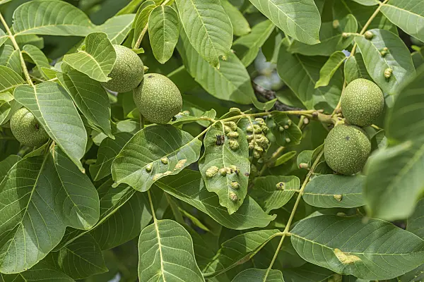 Juglans regia, commonly known as the English walnut or Persian walnut, is a deciduous tree native to Central Asia. It produces edible nuts and valuable timber. The tree grows up to 25–35 meters tall with broad, pinnate leaves. It thrives in temperate climates and is widely cultivated for its nutritious walnuts, rich in omega-3 fatty acids. The wood is prized for furniture and veneer.