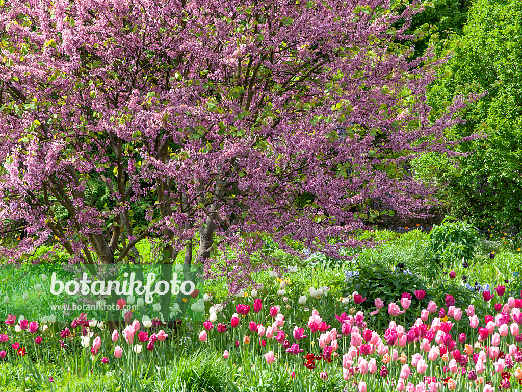 European redbud (Cercis siliquastrum) and tulip (Tulipa)