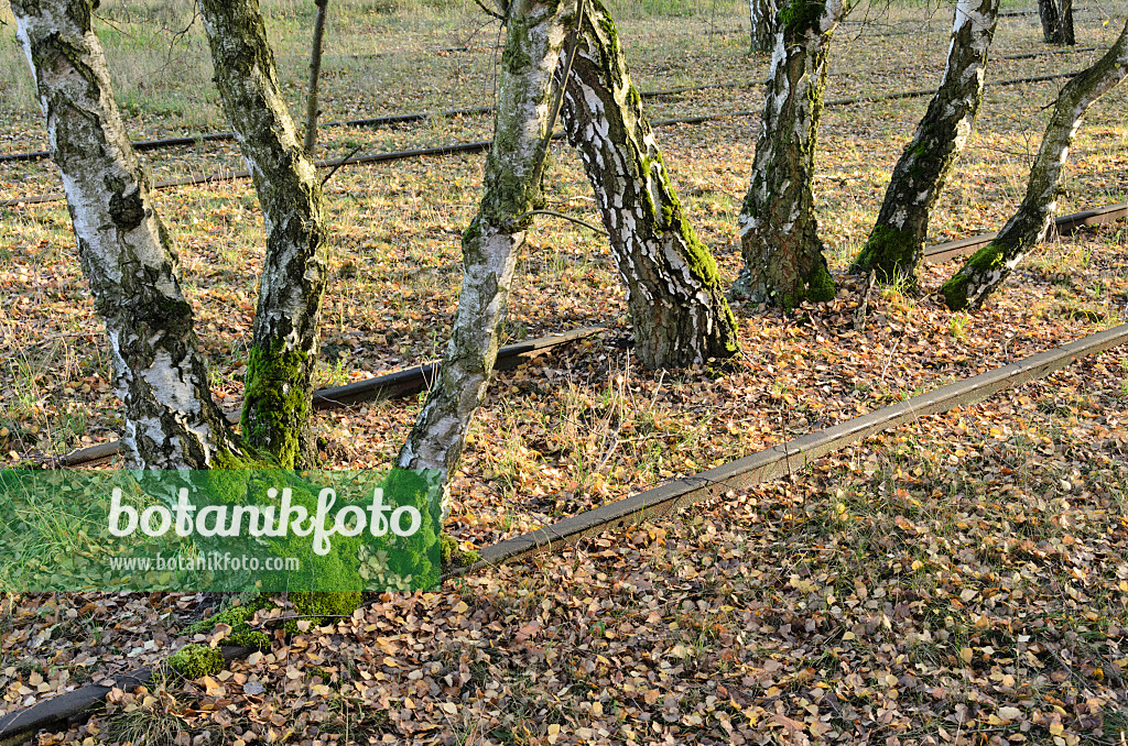 European white birch (Betula pendula) between tracks on an abandoned railway station, Schöneberger Südgelände Nature Reserve, Berlin, Germany