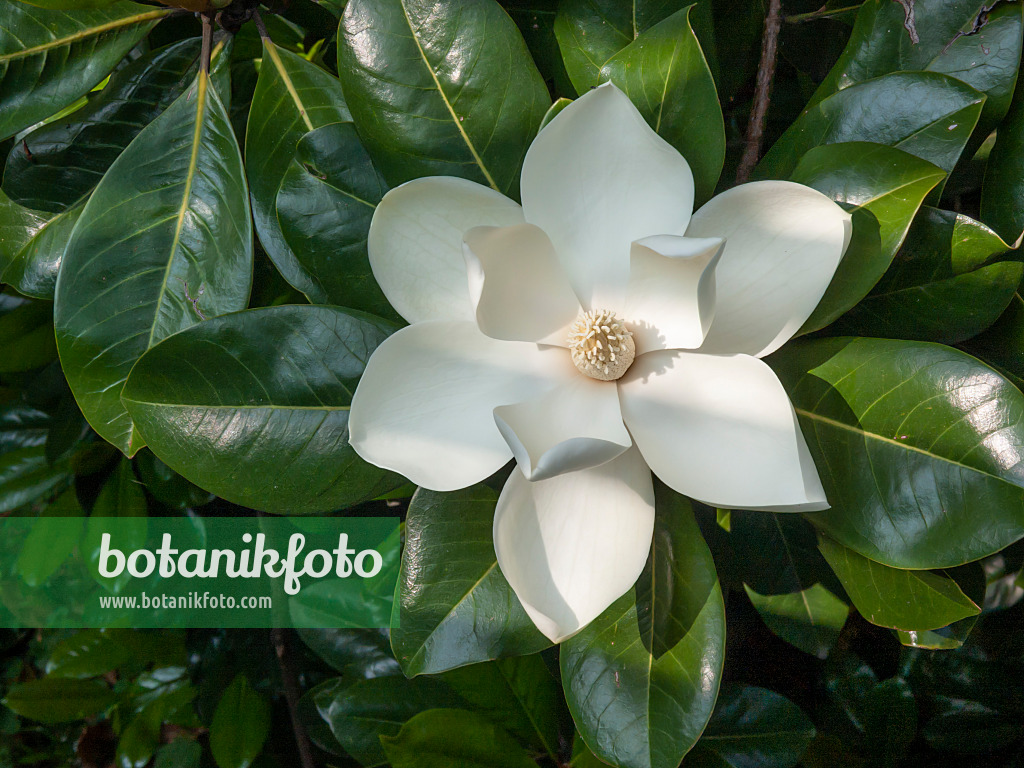 Magnolia grandiflora, commonly known as the Southern magnolia, is a large evergreen tree native to the southeastern United States. It features glossy, dark green leaves and produces large, fragrant white flowers in late spring to summer. The tree can grow up to 90 feet tall and is popular in landscaping for its ornamental value. It thrives in well-drained, acidic soil and prefers full sun to partial shade. The Southern magnolia is also the state flower of Mississippi and Louisiana.