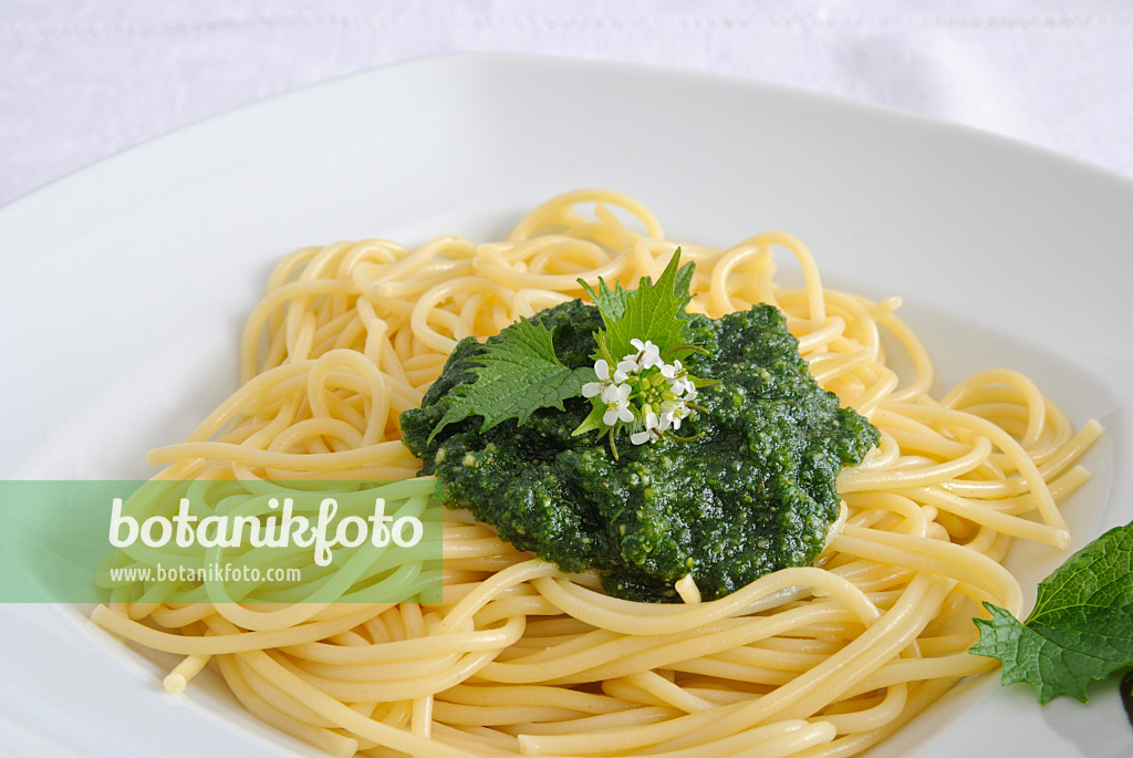 Garlic mustard (Alliaria petiolata) on spaghetti with pesto