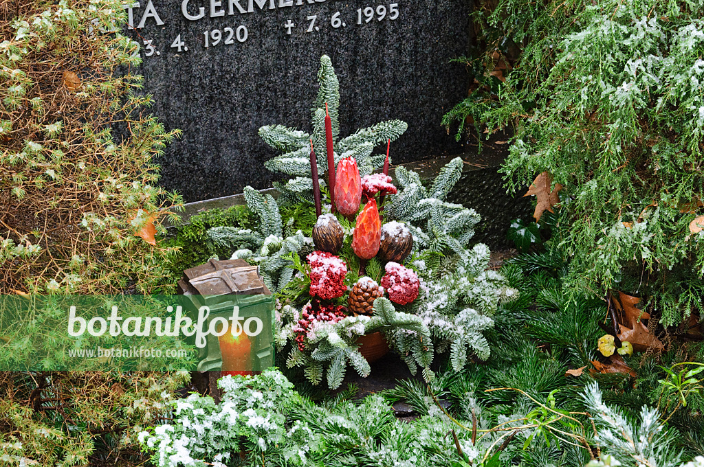 Grave decoration with fir branches, dried flowers and dyed plant parts