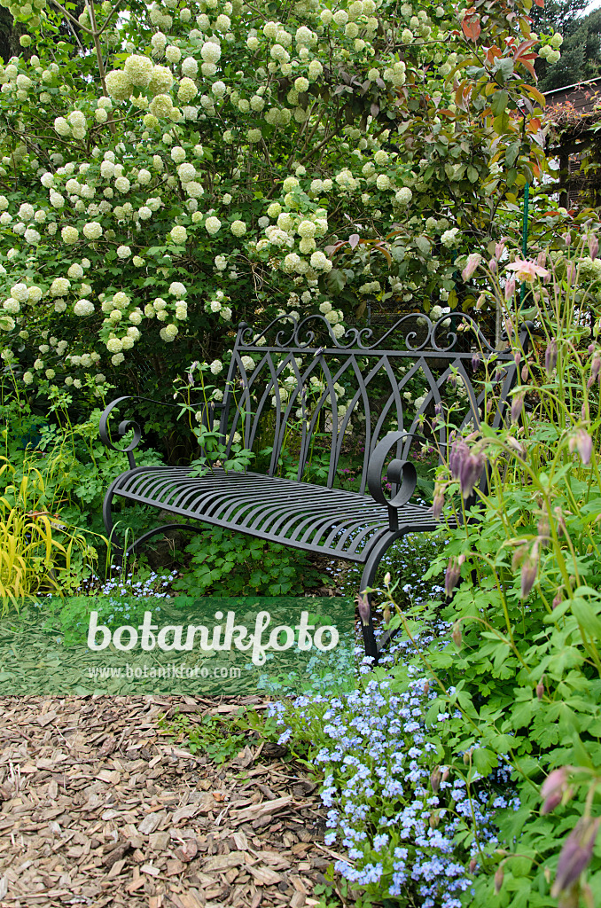 Guelder rose (Viburnum opulus 'Roseum') and forget-me-nots (Myosotis) besides a garden bench
