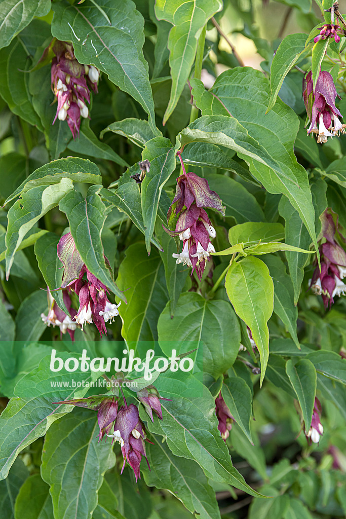 Leycesteria formosa, commonly known as Himalayan honeysuckle or pheasant berry, is a deciduous shrub native to the Himalayas and southwestern China. It grows up to 2 meters tall, with hollow stems and pendulous clusters of white flowers surrounded by purple bracts, followed by dark purple berries. The plant thrives in partial shade and moist soil, attracting birds and pollinators. It is considered invasive in some regions due to its rapid spread. The berries are edible but bland.