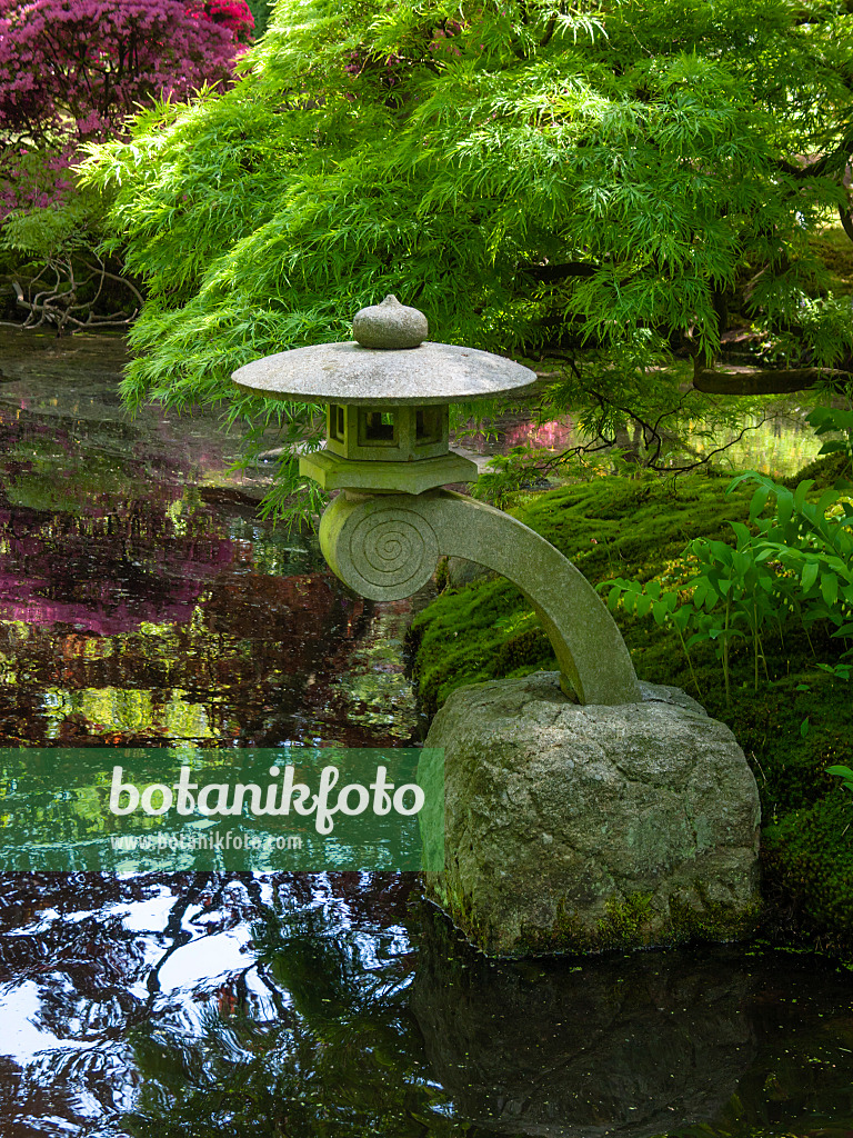 Japanese maple (Acer palmatum) in a Japanese garden with a stone lantern in a pond