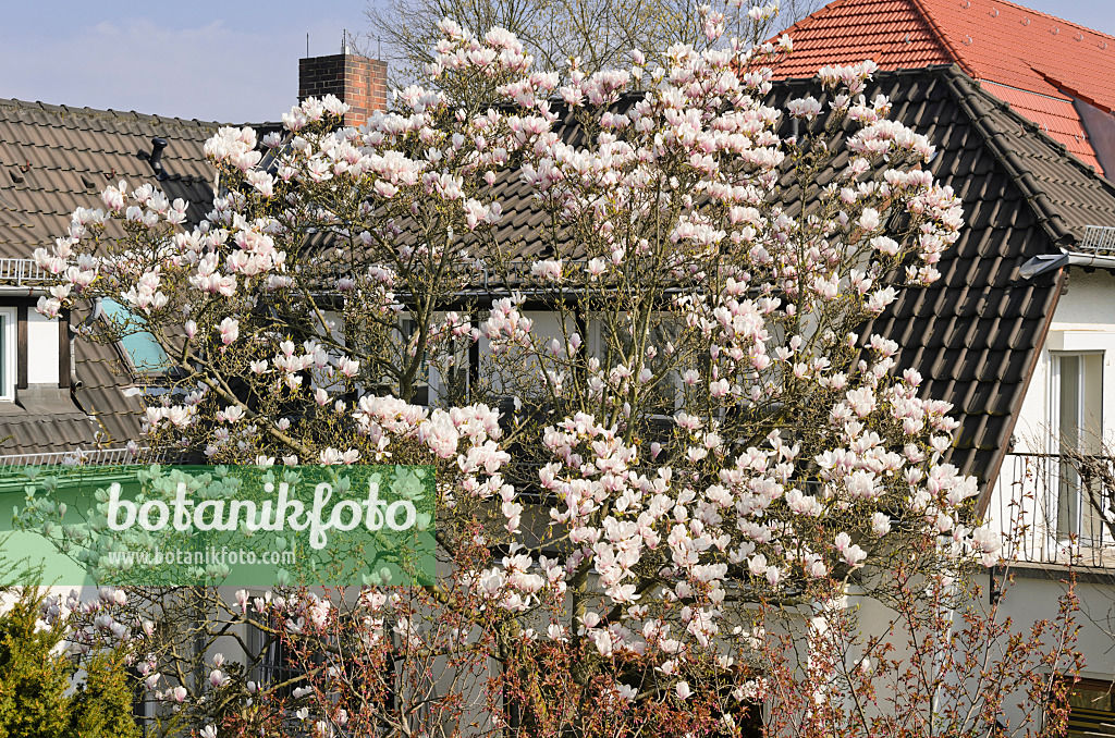 Magnolia x soulangiana, commonly known as saucer magnolia, is a hybrid of M. denudata and M. liliiflora. It is a deciduous tree prized for its large, showy pink-purple flowers that bloom in early spring before the leaves emerge. It grows 20-30 feet tall and prefers full sun to partial shade with well-drained soil. Hardy in USDA zones 4-9.