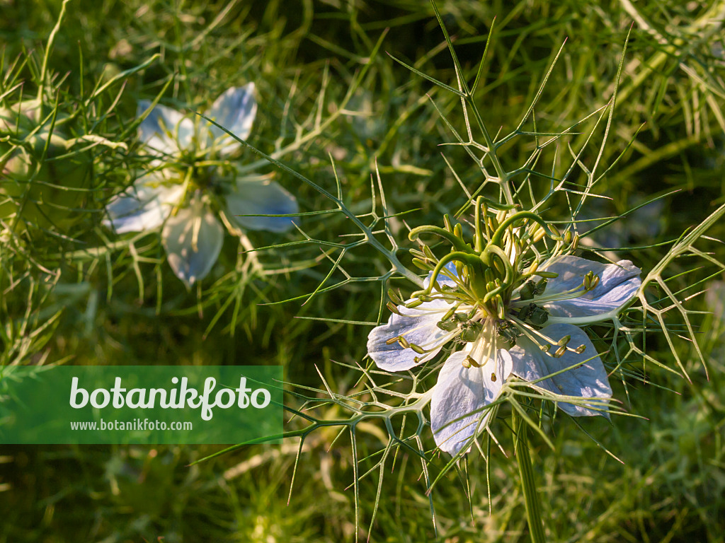 Nigella damascena, commonly known as love-in-a-mist or devil-in-the-bush, is an annual flowering plant native to southern Europe and North Africa. It features delicate, fern-like foliage and distinctive blue, white, or pink flowers surrounded by a mist of fine bracts. The blooms give way to ornamental, balloon-like seed pods. It thrives in well-drained soil and full sun, often self-seeding in gardens. Popular in cottage gardens, it is also used in dried floral arrangements. The plant is non-toxic but not typically consumed.