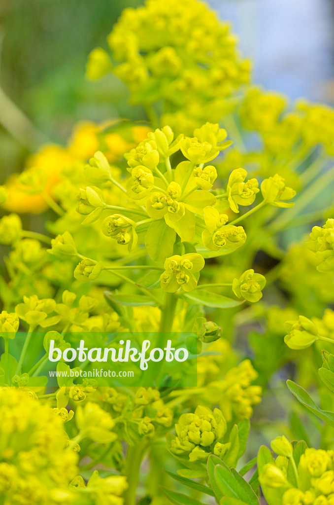 Euphorbia palustris, commonly known as marsh spurge, is a perennial herbaceous plant native to Europe and parts of Asia. It thrives in wet, marshy habitats and produces bright yellow-green bracts in spring. The plant contains toxic latex, typical of the Euphorbia genus, which can irritate skin and eyes. It grows up to 1 meter tall and prefers full sun to partial shade. Its striking appearance makes it popular in ornamental gardening, but caution is advised when handling.
