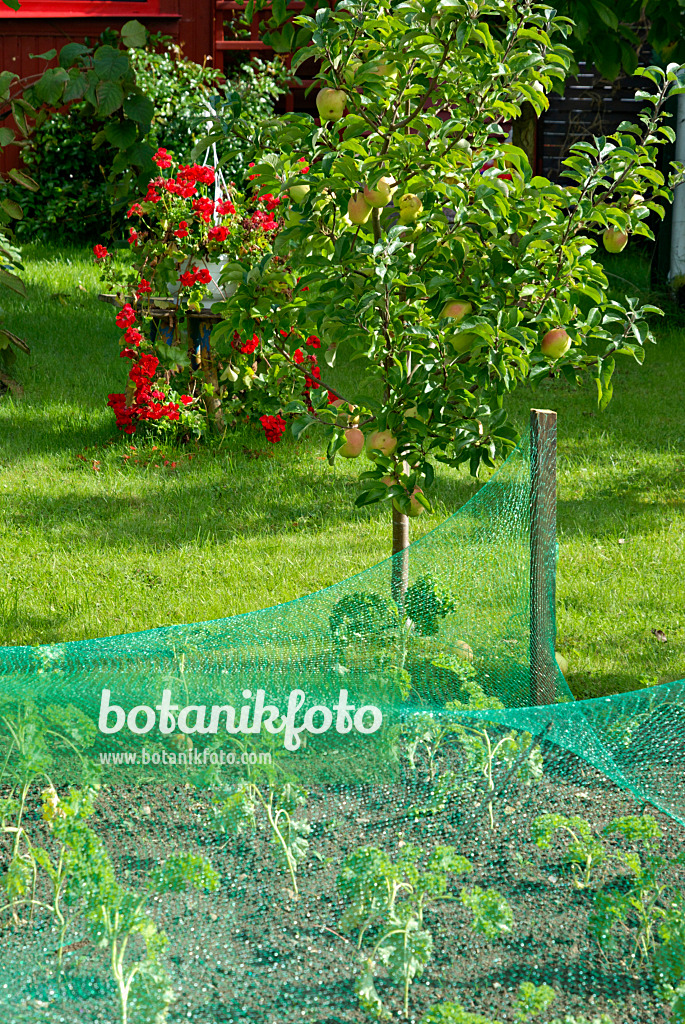 Orchard apple (Malus x domestica) and vegetable bed with bird net