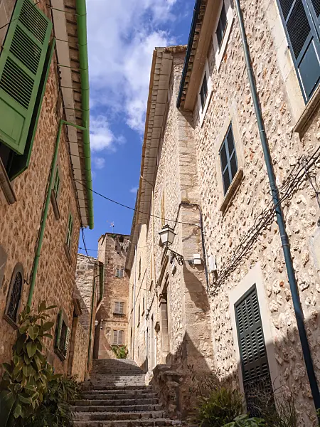 Overgrown mountain slopes with stone house and bluish hazy background, Sóller, Mallorca, Spain