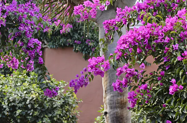 Bougainvillea glabra, commonly known as paperflower, is a flowering plant native to South America. It is a woody vine or shrub with thorny stems and vibrant, paper-like bracts that surround small white flowers. It thrives in warm climates, prefers full sun, and is drought-tolerant once established. Often used in landscaping for its colorful display, it requires minimal care but benefits from pruning to maintain shape.