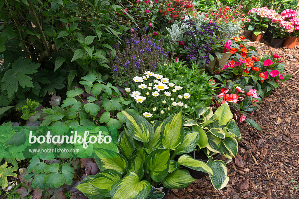 Plantain lilies (Hosta), daisies (Leucanthemum), garden heliotrope (Heliotropium arborescens) and buzy Lizzie (Impatiens walleriana)