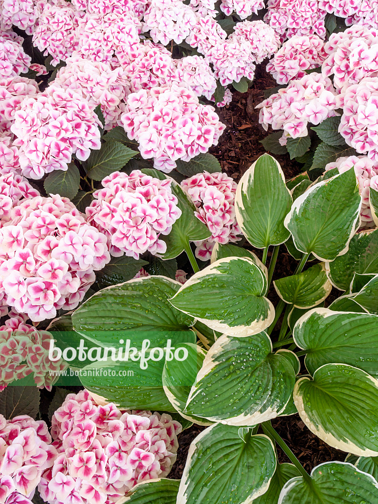 Plantain lily (Hosta) and big-leaved hydrangea (Hydrangea macrophylla 'Red Ace')